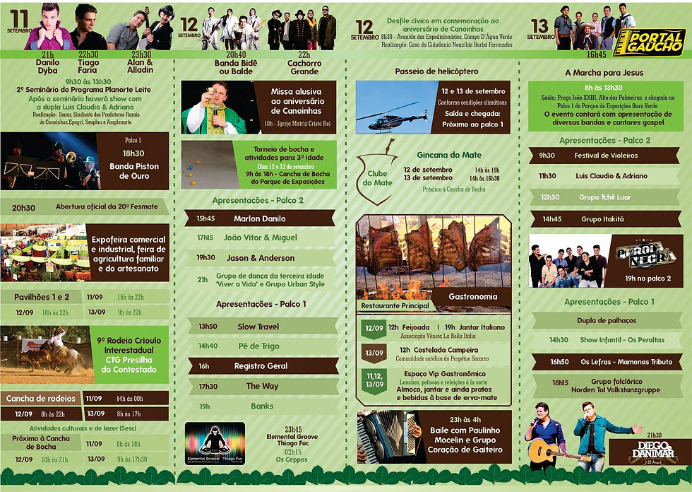 Já o secretário Edmilson Verka, que é presidente da Comissão Central Organizadora da Fesmate, explanou toda a programação de shows e atividades que irão acontecer durante a festa, e enfatizou o objetivo principal do evento. “Nosso objetivo é proporcionar um momento de diversão e lazer para todas as famílias canoinhenses”, comentou. A 20ª Fesmate acontece nos dias 11, 12 e 13 de setembro, no Parque de Exposições Ouro Verde. E conta com uma programação de diversos shows de artistas locais, regionais e nacional. Além do rodeio crioulo, expo-feira, gastronomia típica, seminário do Programa Planorte Leite, Velocross, mateadas diárias entre outros atrativos para toda a família. A festa tem portões abertos ao público durante os três dias de evento.