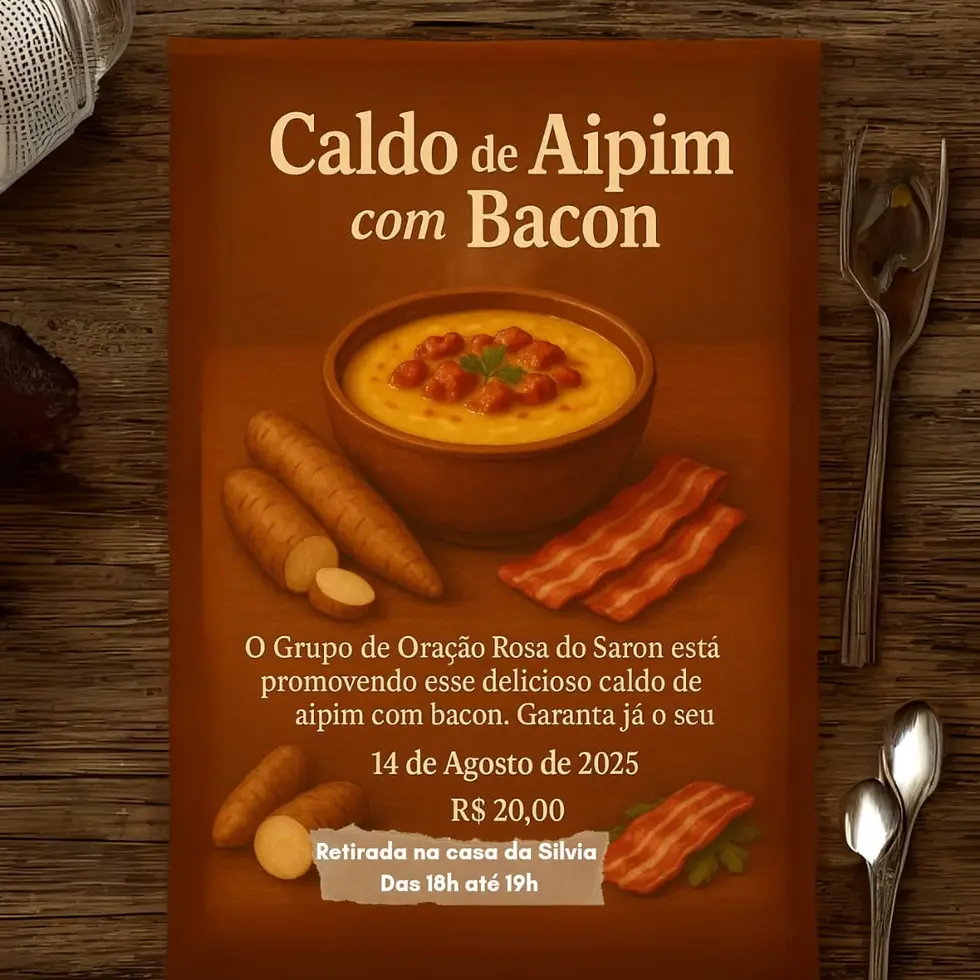 Caldo de Aipim com BaconJota Júnior20 de ago. de 20251 min de leituraO Grupo de Oração rosa do Saron está promovendo esse delicioso caldo de aipim com bacon. garanta já o seu dia 14 de Agosto de 2025 valor R$ 20,00